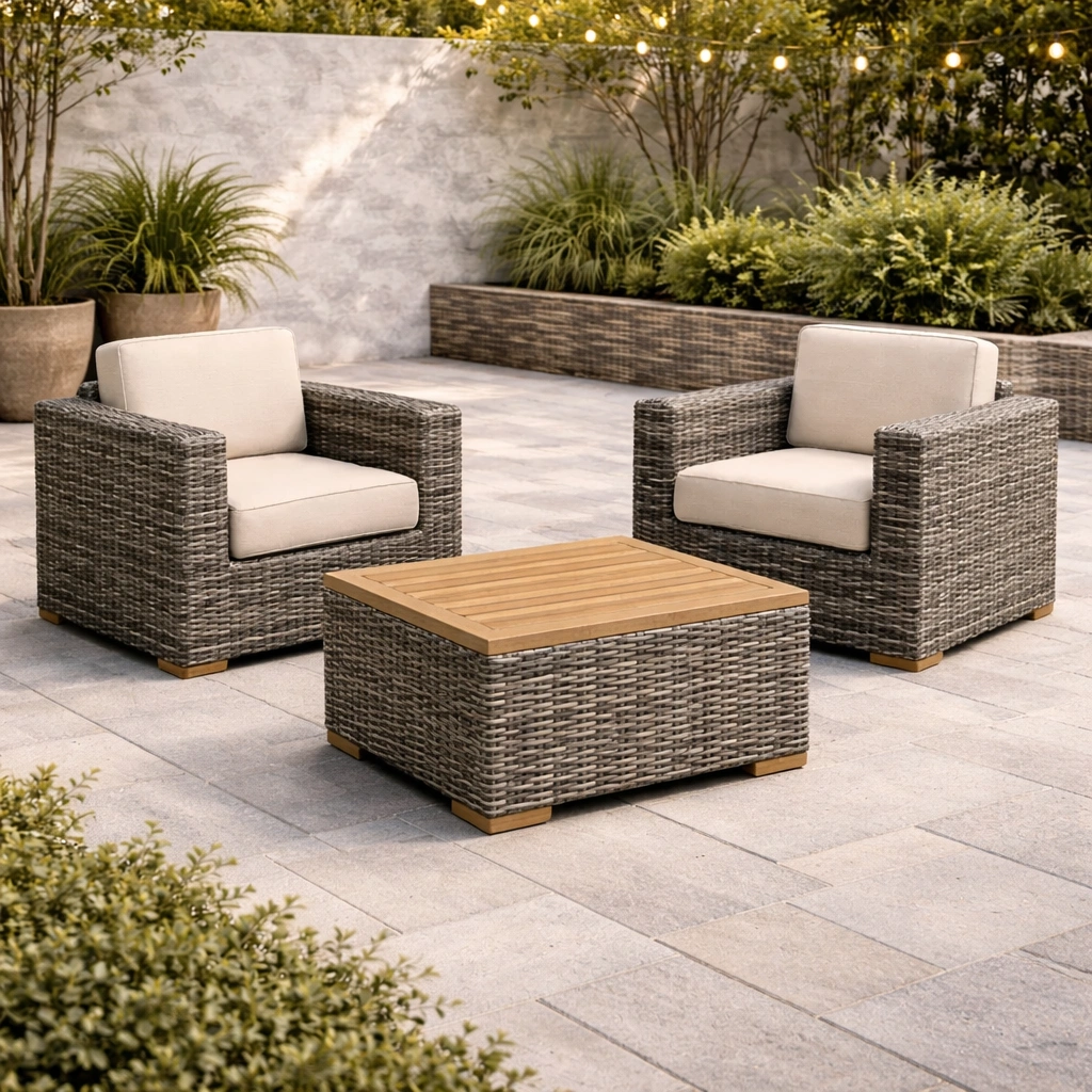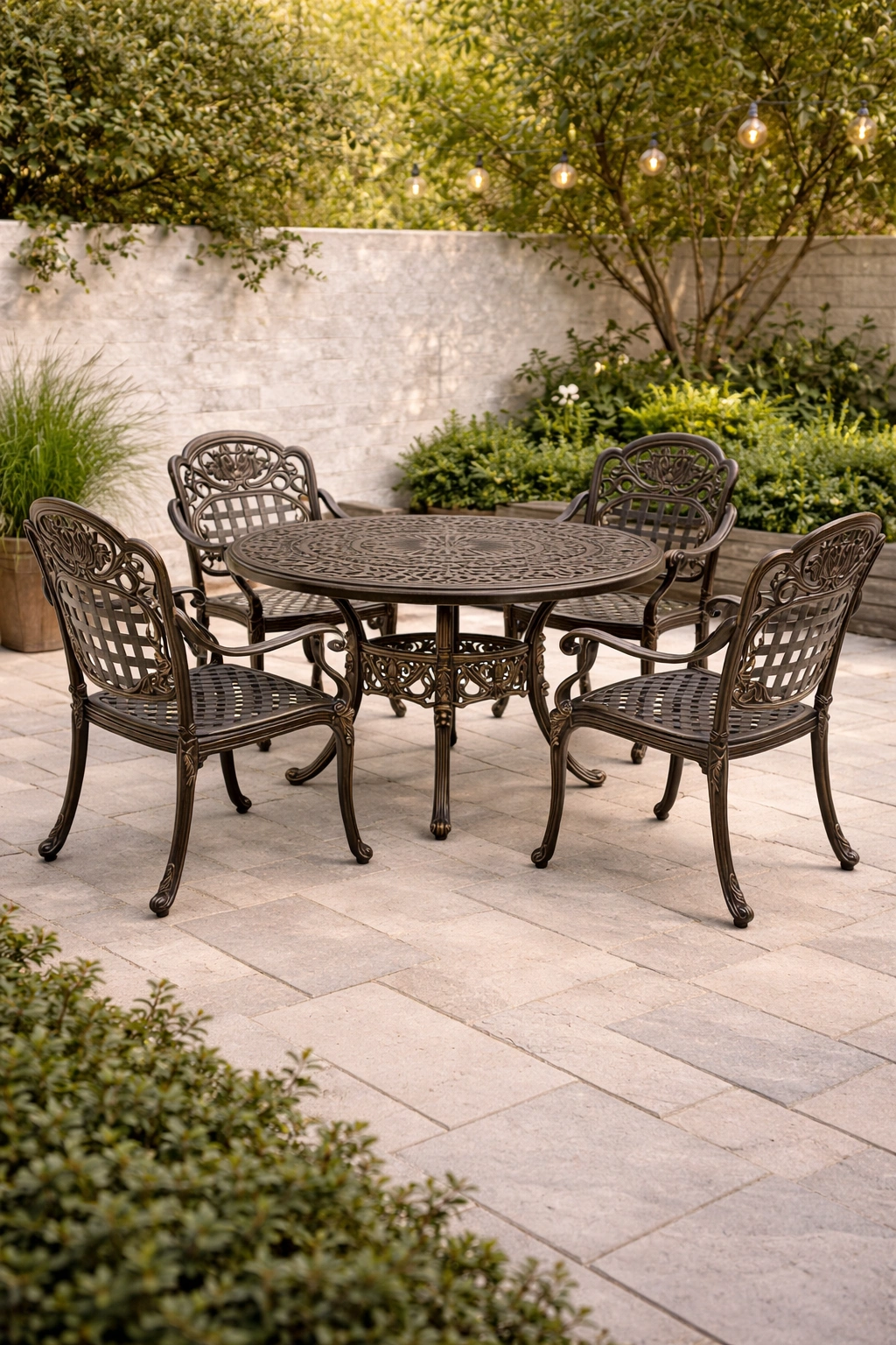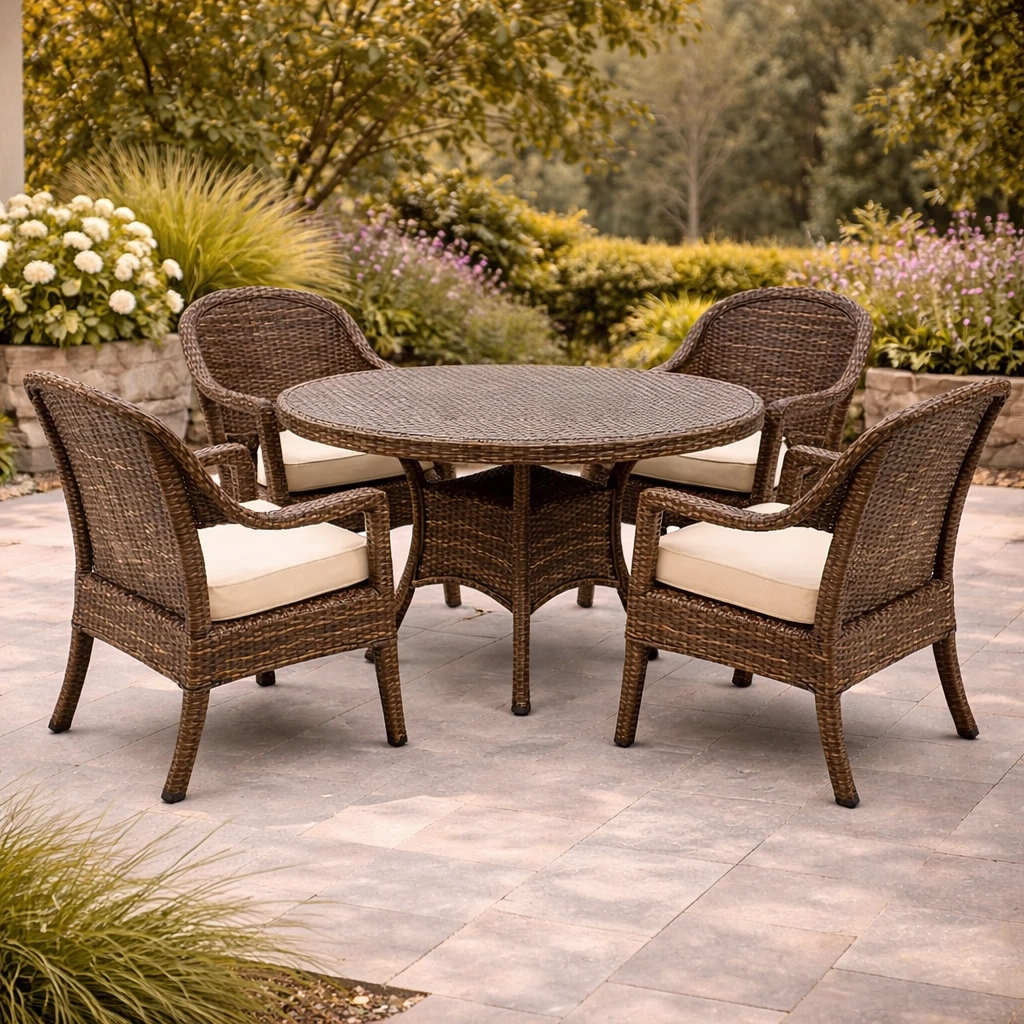Ensemble de table et chaises adapté aux espaces de jardin et de terrasse, doté d’une structure stable, facilitant l’utilisation quotidienne et la mise en place.
