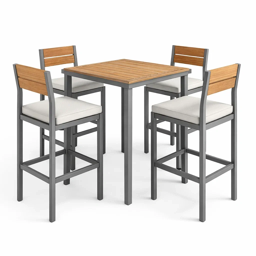 Ensemble de bar en acacia et métal gris avec table carrée et quatre chaises