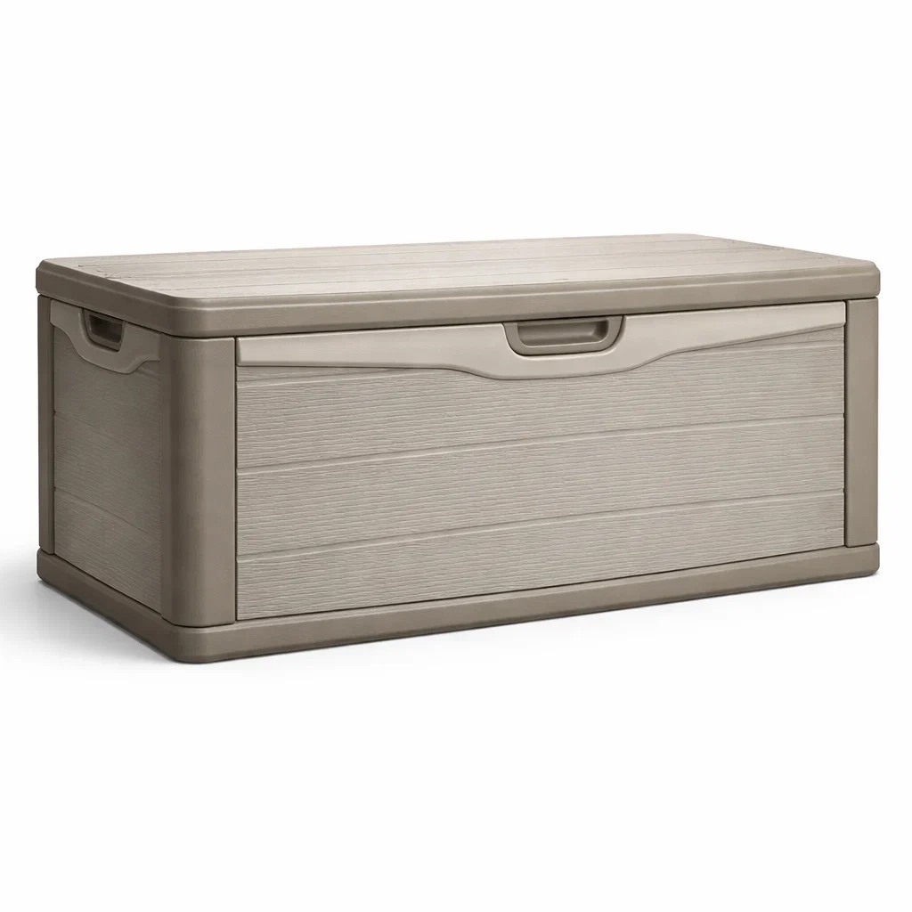 Ce coffre de rangement est fabriqué en polypropylène, offrant robustesse et durabilité pour un usage extérieur. Il mesure 117 cm de longueur, 45 cm de largeur et 57 cm de hauteur.