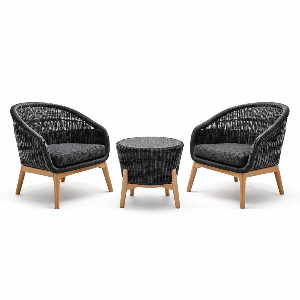 Les fauteuils sont en résine tressée avec une structure en bois de teck. Les coussins sont en tissu polyester avec rembourrage en mousse. La table est également en résine tressée avec une structure en bois de teck.